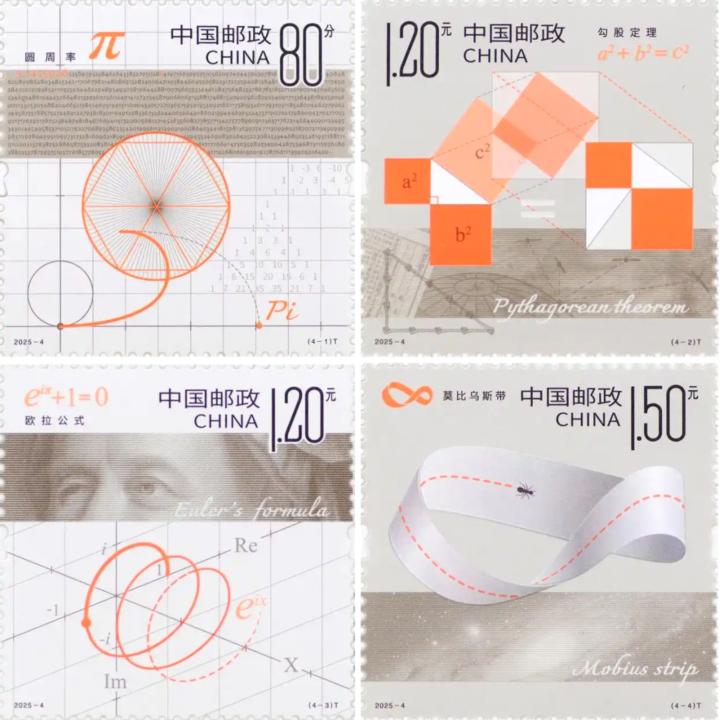 中国邮政发行了“数学之美”特种邮票,包括圆周率、勾股定理、欧拉公式、莫比乌斯带。