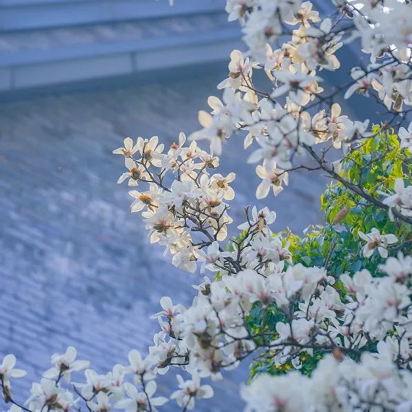 大朵玉兰花,或绽放在枝头,自由伸展;或者三两个环绕,“交头接耳”。花瓣像羊脂玉一样温柔,透明的质感在阳光下轻轻拂过下半部分是美丽的。