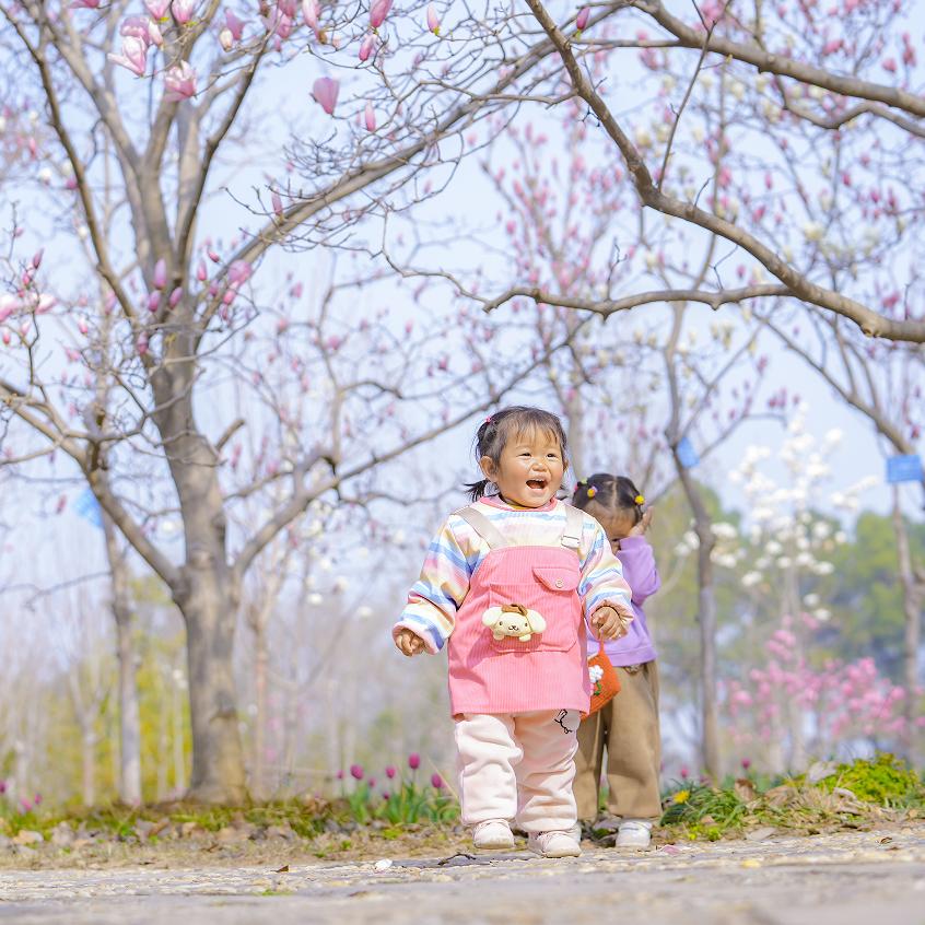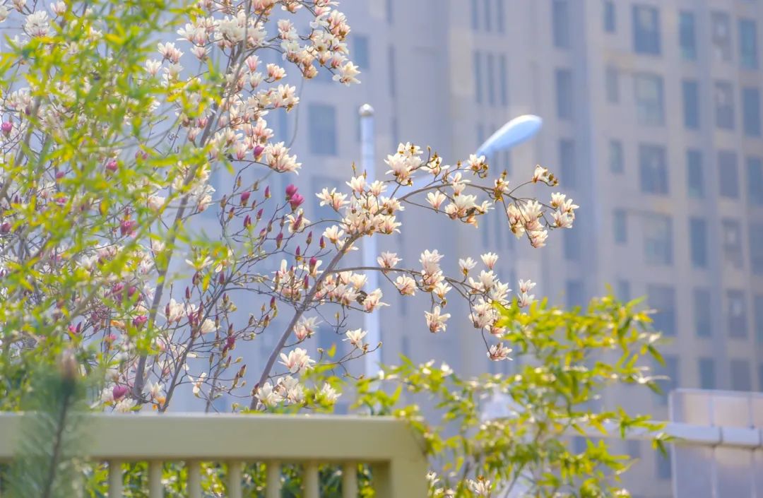 在玉兰树下,孩子们嬉戏玩耍,老人们悠闲地聊天,鲜花与笑声交织在一起,构成了一幅温馨的城市生活景象。