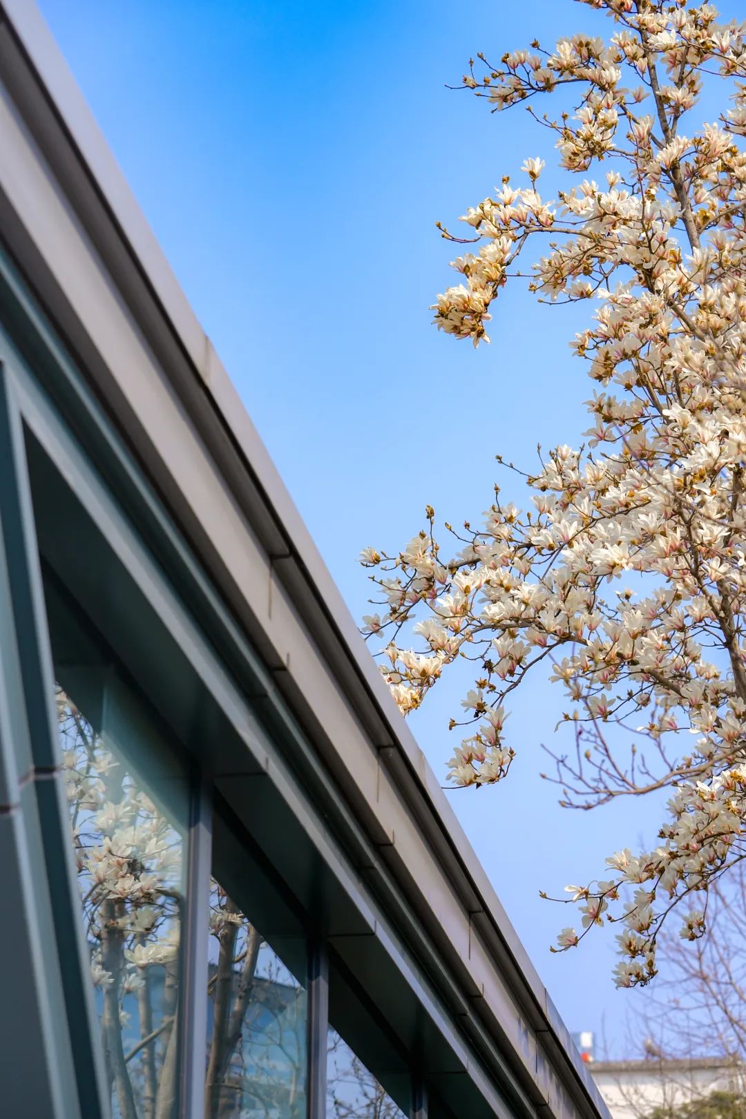 转过街角,不小心抬头,你会发现城市道路两旁的玉兰花也在悄然绽放。