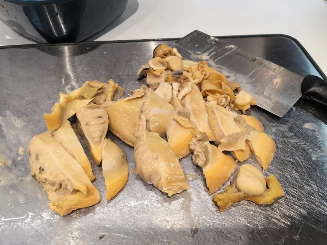 用刀背反复敲击蚌肉边缘使肉质疏松,然后切成小块。