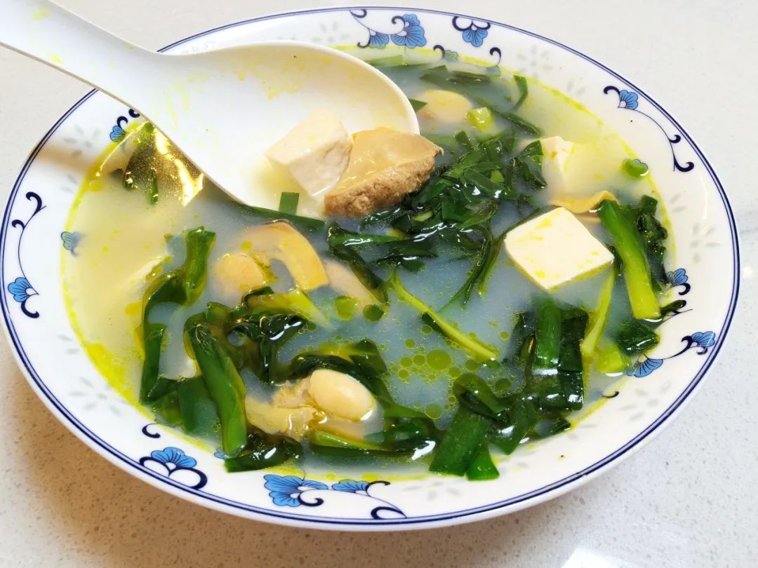 滚油起油,将韭菜切成块,放入锅中翻炒,最后加入汤中,撒上胡椒粉调味。