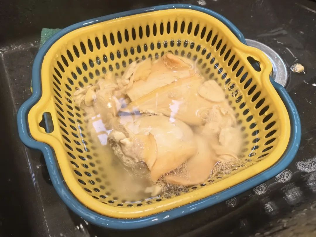 河蚌去壳,洗净后清除肠鳃等内脏,再用盐浸泡,轻揉后清除粘液。