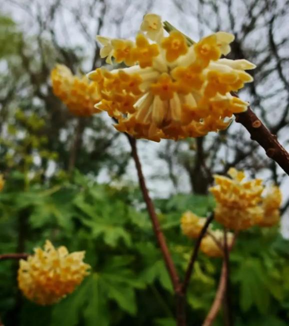 一朵香花的大小就像婴儿的拳头,是由十几朵管状花组成的头状花序。形成花球的小花有四个金色的“花瓣”,但实际上这四个花瓣不是花瓣,而是花萼。它们真正的花瓣已经消失了,这也是香味所在的瑞香科植物的一个重要特征。