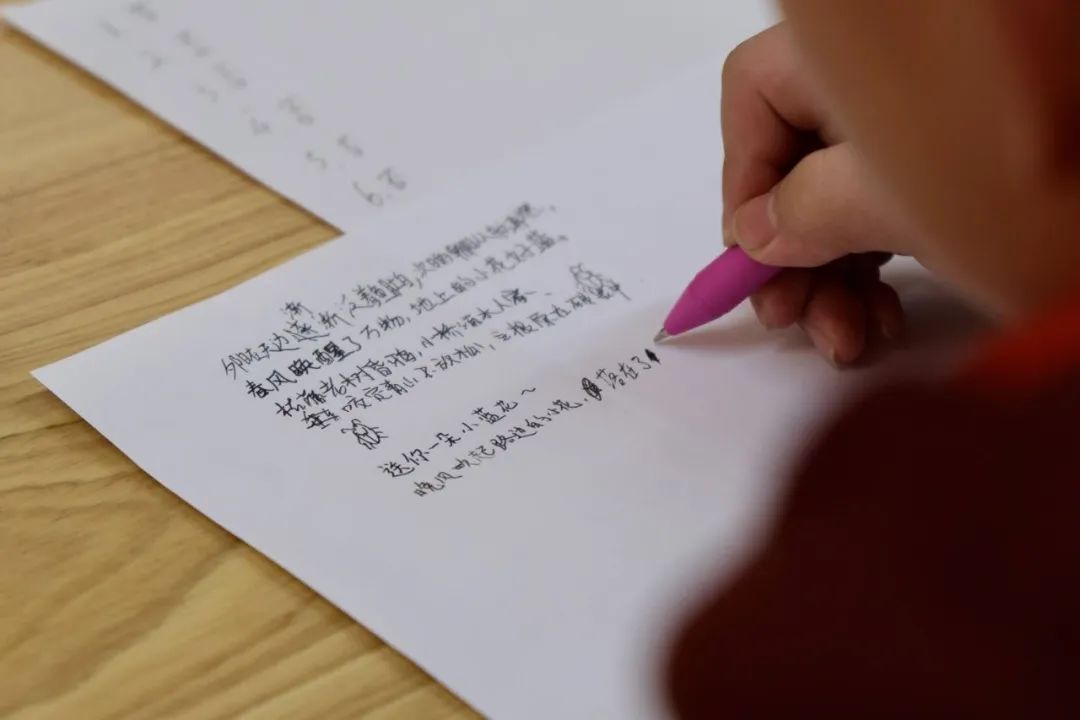活动结束时,10名学生被授予“一朵美丽的小蓝花”社校联动实验课程研究小组成员称号。学生们还一起接龙作词,融入了第一课的学习感受和友好理念。“晚风吹起路边的小花,落在记忆中的夕阳下……”学生们用优美的文字轻轻哼唱。