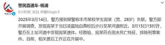上海警方通报复旦博士失联:系溺水死亡,排除刑事案件