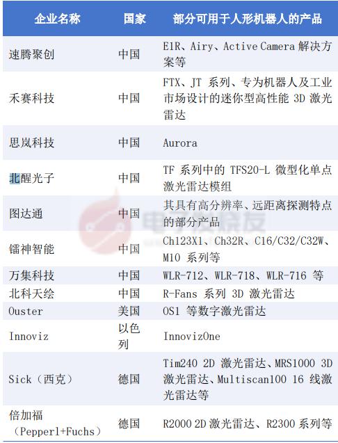 目前,速腾聚创、和赛科技、思岚科技、北醒光子、图达通等。可以在中国生产可用于人形机器人激光雷达的公司。具体情况如下表所示: