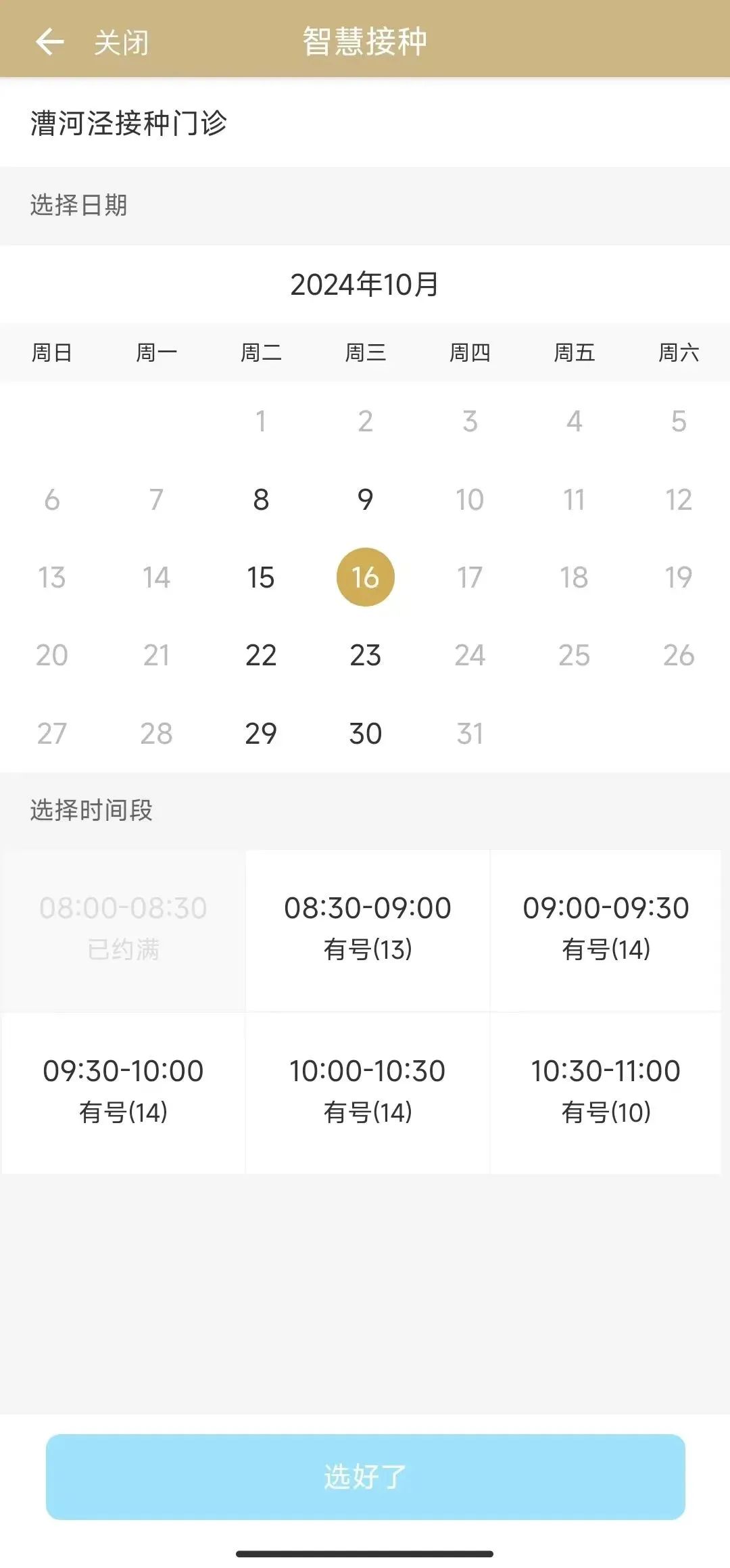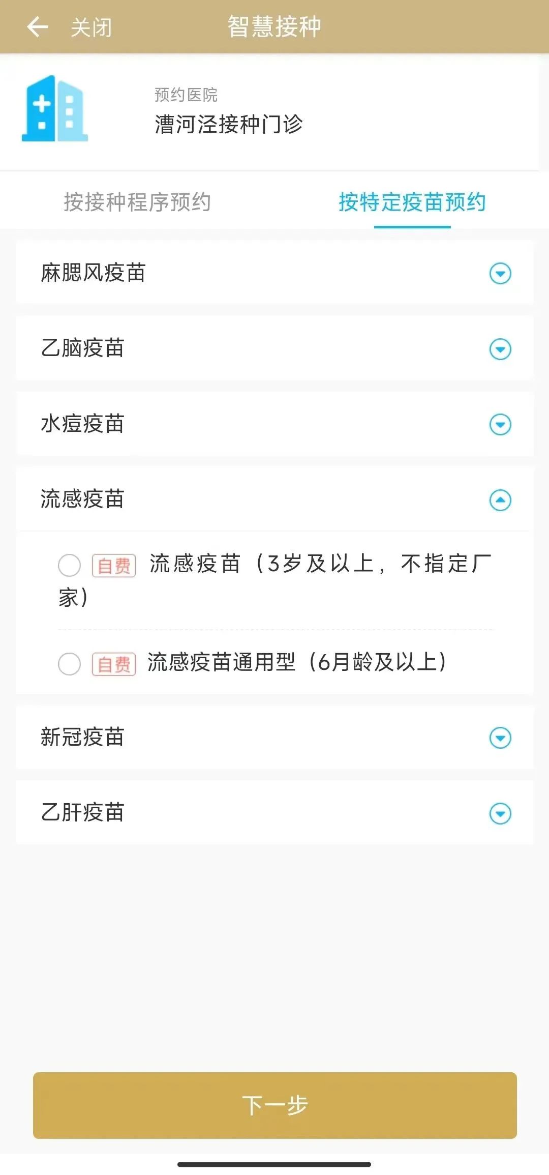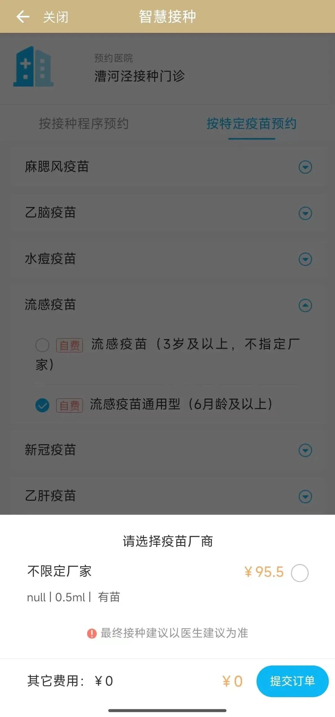 选择通用型(6个月以上)的流感疫苗,并选择预约日期和时间。
