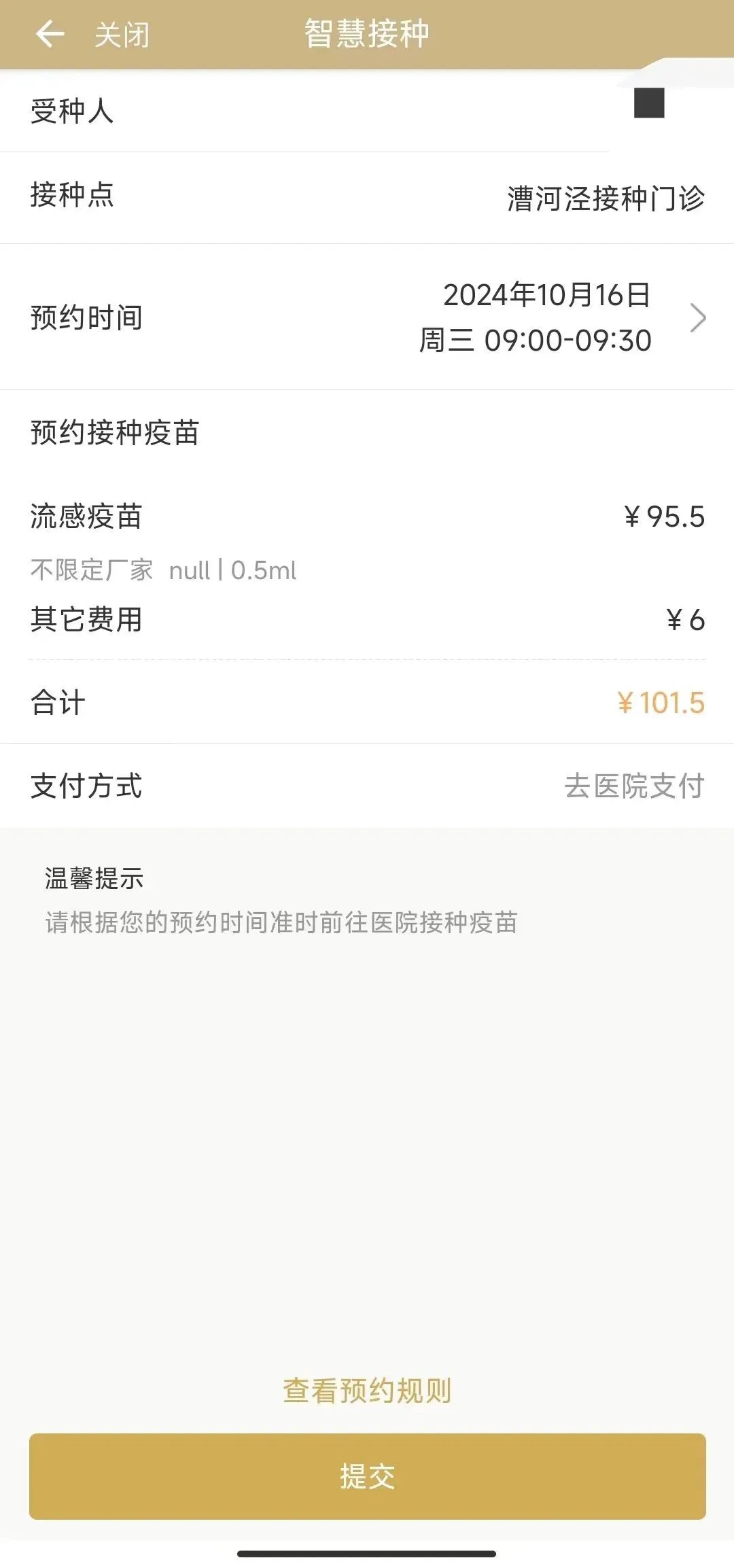 确定受种人,预约信息,并在阅读预约规则后提交预约订单。