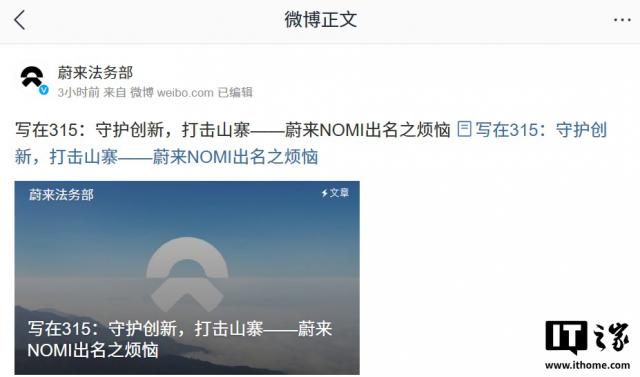 IT 世家 3 月 15 今天,蔚来法务部发表了一篇文章,写在今天。 315:保护创新,打击山寨 —— 蔚来 NOMI 著名的苦恼,表示市场上出现了大量严重的侵权行为,包含山寨 NOMI 机器头,粗暴复制抄袭表情设计等等。