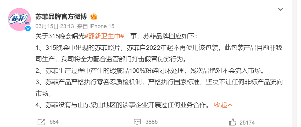 15日晚11时13分,“苏菲”官方微博回应称,“自2022年以来,苏菲不再使用央视‘3·15’晚会上存在的苏菲照片。这种包装产品目前不是我们公司生产的,我公司将全力配合监管机构打击假冒伪劣行为。”