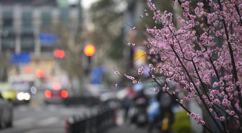高架路下,汶水路地铁站旁,静安中环公园的美人梅“接力”之前盛开的红梅,重叠,密密麻麻,妩媚迷人。