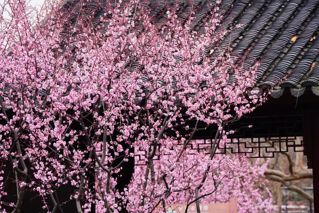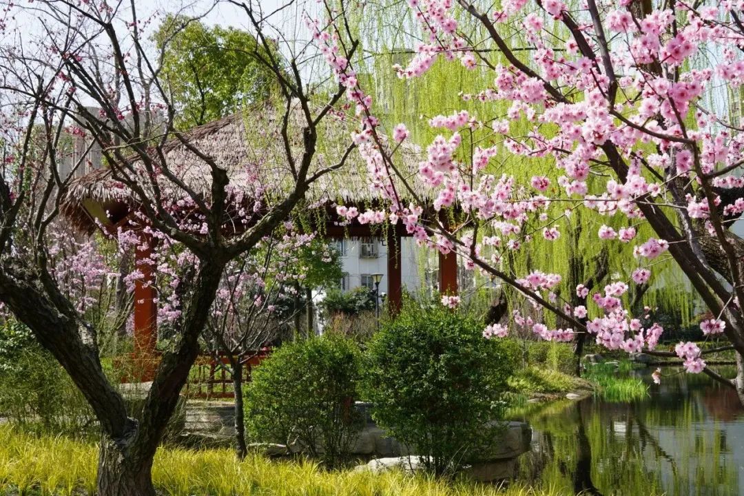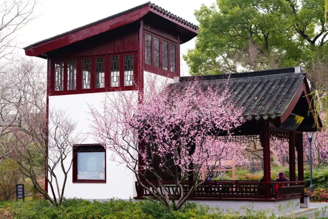 闸北公园的美人梅主要集中在双枫双院右边——系统岛周围,粉红色的花朵与共和亭古朴的建筑风格相得益彰。