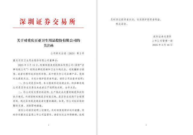 IT 世家 3 月 16 据日报道,深圳证券交易所上市公司今天管理了一家重庆百亚卫生用品有限公司(IT 世家注:“自由点”母公司发出关注函,要求公司自查并说明:企业是否知道,参与上述违规业务报告?,与涉案违法企业存在交易往来或应当表明的关系、合作关系;与企业有关;原材料采购、生产缺陷产品处置机制及实际执行情况,内控机制是否有效运行,是否存在?非法流通或处理不合格原材料、缺陷产品的漏洞。,如果是这样,企业就会采取改进、消除影响的措施。