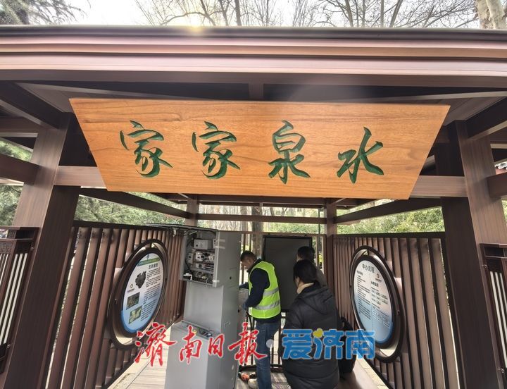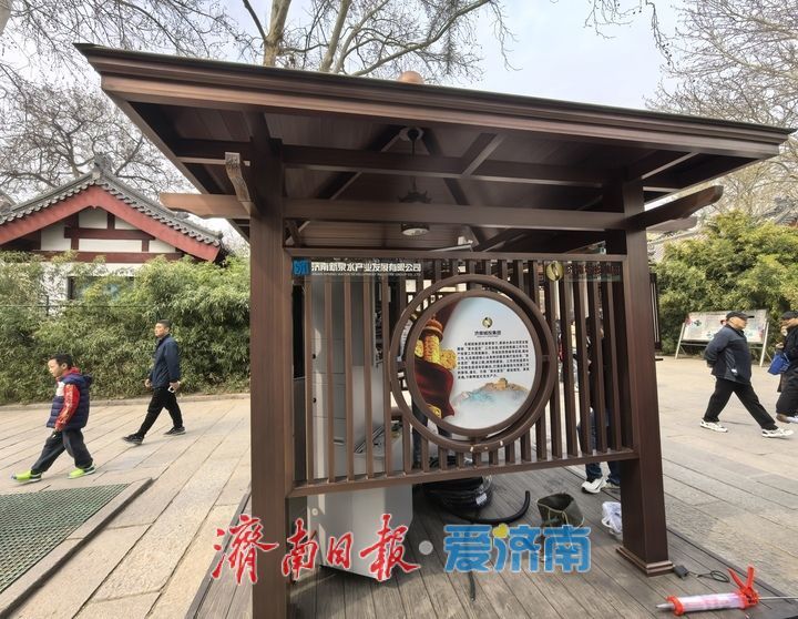 3月15日,济南百花公园西门出现了一个古色古香的仿古亭子,工作人员正在亭子里安装泉水直饮取水设施。亭子上挂着“家家泉水”的牌匾,亭子旁边安装了一台压泉直饮设备。
