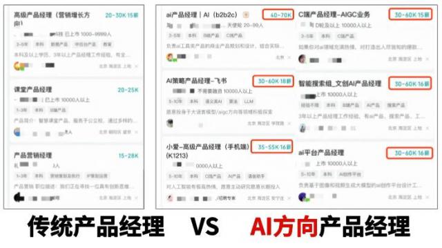 具有 AI 有能力的产品经理,工资基本都在 40~60k!高于传统产品岗位!有些产品人早就转行了! AI 方向,早就拿到了百万年薪 offer!
