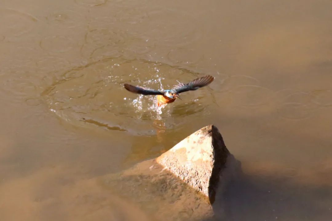 鸟儿站在小树枝上,叽叽喳喳,凝视着小溪的水面,看着水中的声音。当一条小鱼游动时,它迅速瞄准目标,像箭一样跳起来,奔向水面。然后,他们的身体很快进入水中,几乎一击而中,抓住一条小鱼,然后飞回树枝,继续蹲在树枝上。