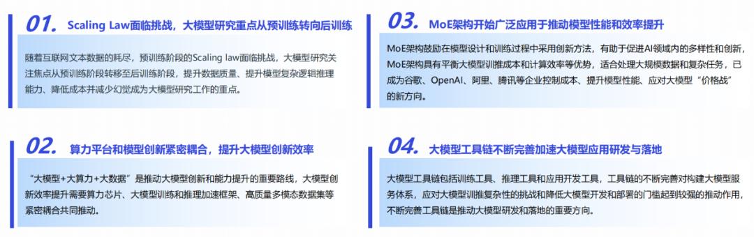 当前AI大模型技术发展呈现四大趋势:(1)Scaling Law面临挑战,大模型研究重点从预训练转向后训练;(2)算力平台和模型创新紧密耦合,提升大模型创新效率;(3)MoE架构开始广泛应用于推动模型性能和效率提升;(4)大模型工具链不断完善加速大模型应用研发与落地。