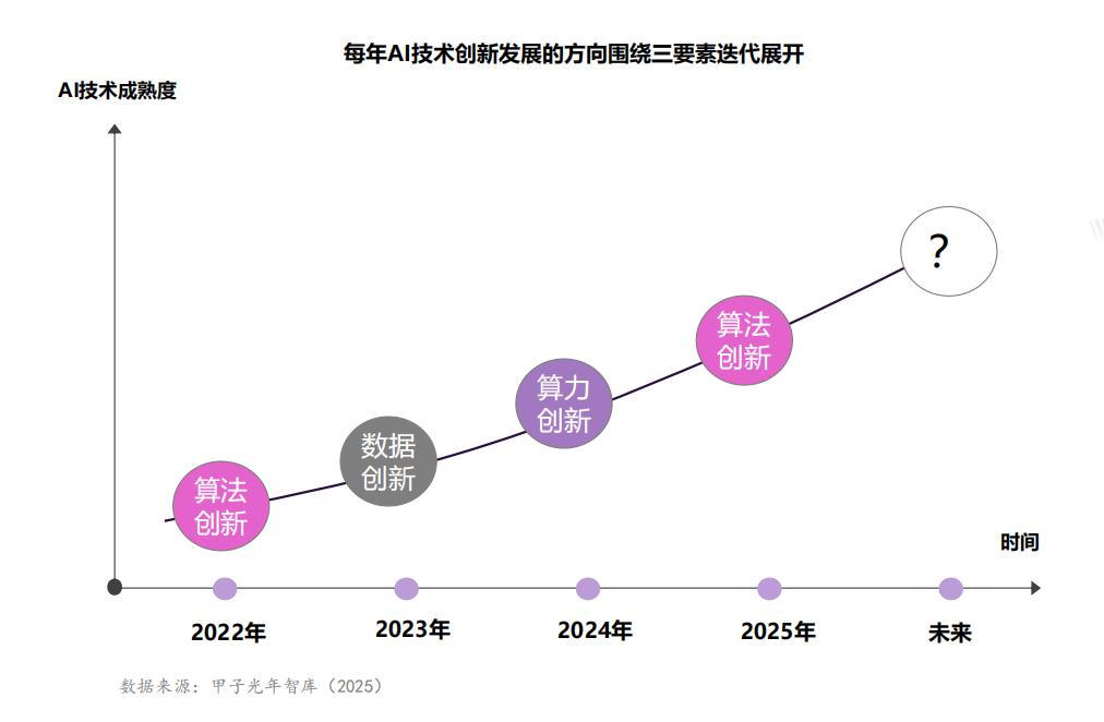 大模型算法核心三要素的创新循环:算力、数据、算法的三角创新体系,在动态循环之中再次进入算法创新阶段。2022年:算法创新为主,ChatGPT发布,引发Transformer架构的风潮迭起。2023年:数据创新为主,数据合成、数据标注等成为高质量数据集建设的热点方向。2024年:算力创新为主,算力迈向超万卡时代,算力运营商等产业新物种诞生。2025年:再次进入算法创新阶段。