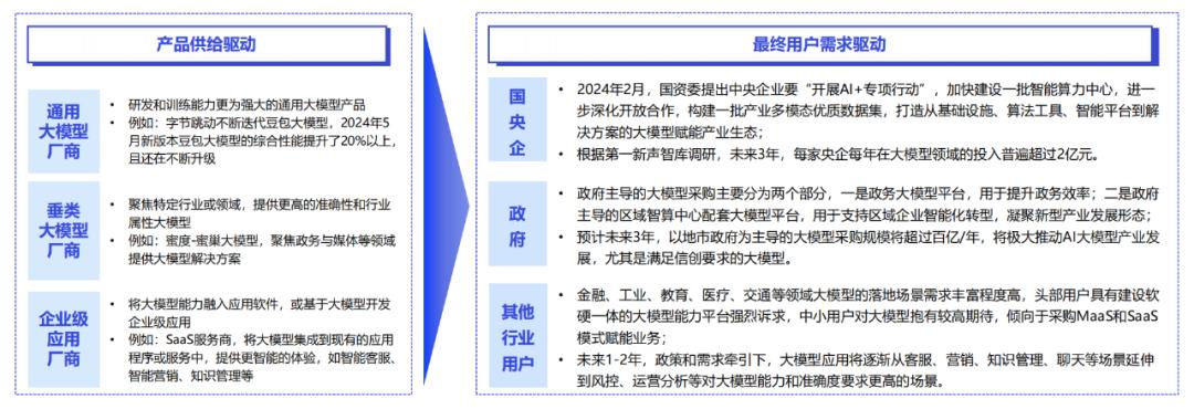 当前大模型市场还处于产品供给驱动为主的阶段,预计未来3年,随着大模型应用被行业用户广泛接受并积极推动应用场景落地,中国大模型市场发展将进入以最终用户需求驱动为主的阶段。