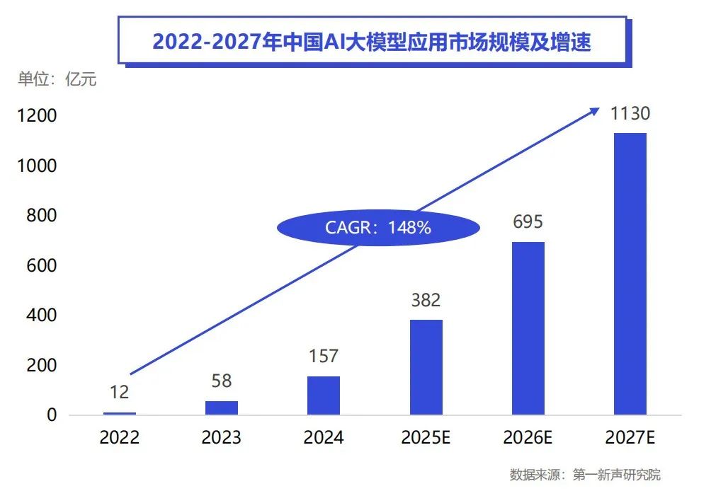 根据第一新声智库研究,2022—2027年中国AI大模型应用市场规模复合增长率将达到148%,至2027年,AI大模型市场规模将达到1130亿,AI大模型行业达到盈利临界点。
