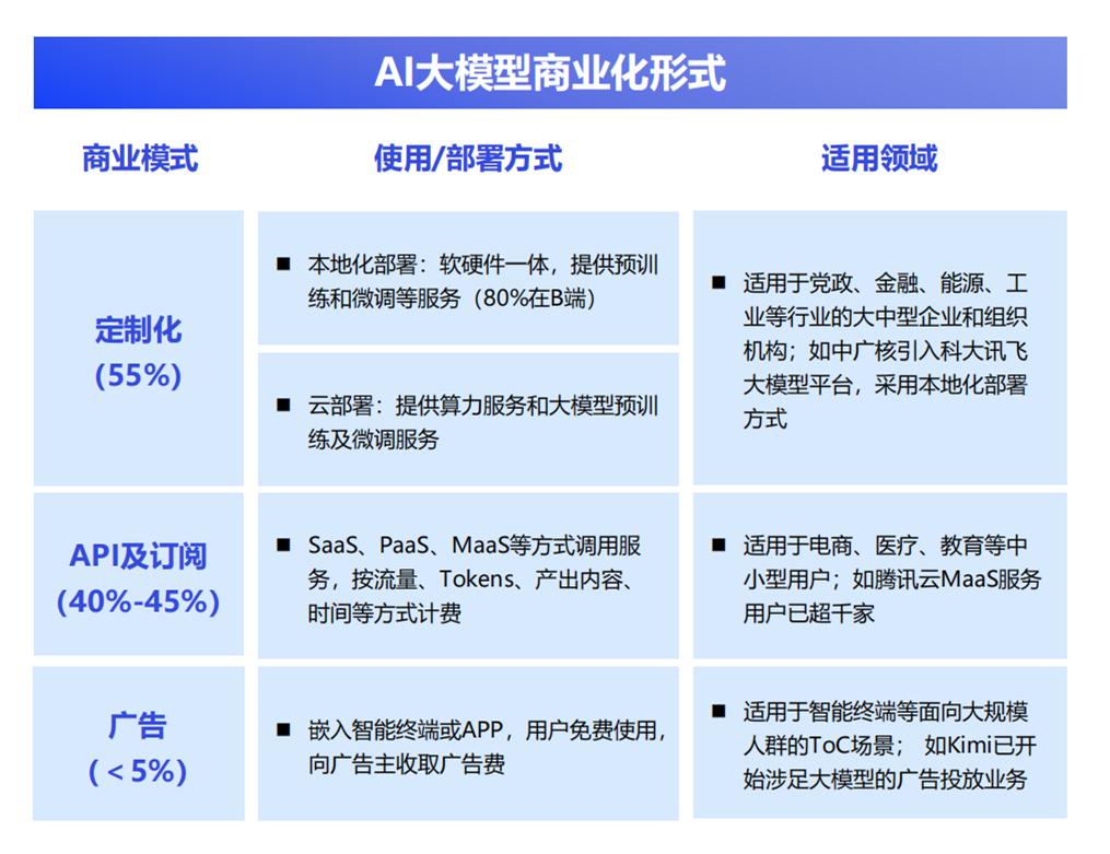 AI大模型商业化落地:55%为定制化模式、40%~45%为API及订阅模式。当前我国AI大模型市场应用的商业化模式逐渐清晰: