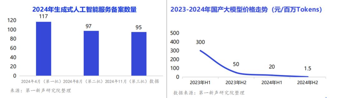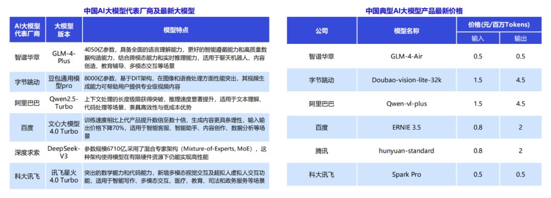 当前AI大模型产品进化路线有两条,一是通过增加模型参数量、扩大数据集、提升训练计算量来获得性能更强大的大模型产品;二是通过优化模型架构适应性和计算效率,获得更具性价比的产品,如70B参数的模型,通过优化架构和训练策略,可获得接近或超越更大规模模型的性能。随着大模型能力和性价比的提升,国产大模型厂商开始大幅降价,截止2024年底,我国典型AI大模型的价格下降至0.5元/百万Tokens以内,为大模型应用的广泛落地打下了基础。