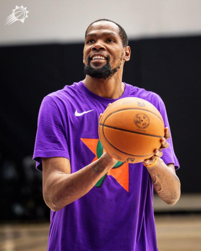 按照赛程,下一场太阳将与湖人队进行客场比赛,这将是本赛季两队的第一场比赛 4 第二次交手,杜兰特无缘詹姆斯(腹股沟拉伤),之前三次交锋,太阳 2 胜 1 负面;今天太阳官方晒出了一张将迎战湖人队的训练照,杜兰特身穿紫色训练。 T t恤,面带微笑很轻松。