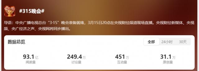但是在晚会之后,关于 315 晚会的话题,阅读量直接冲向 93.1 亿,网民互动量也突破了。 451 万,整个评论区堪称“大型破甲现场”。