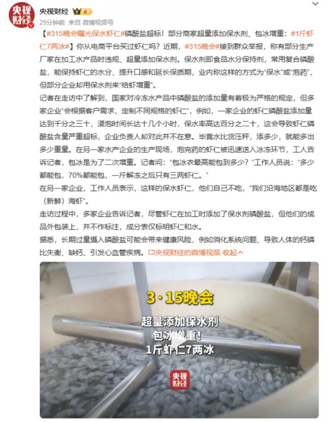 为了让虾卖得更重,一些商家添加了超标磷酸盐。吃太多这种磷酸盐会导致人体消化系统的健康问题,或者导致缺钙和心血管疾病。