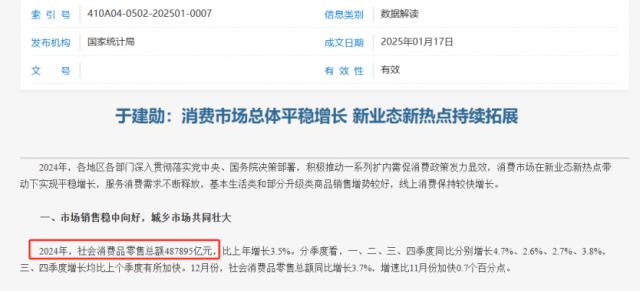 但根据国家统计局,2024 全年社会消费品零售总额超过全年 48.8 万亿元。