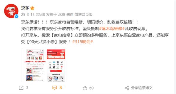啄木鸟曝光后,京东官微发文称,京东承诺,京东家电直接维修,实价,乱收费双倍赔偿。
