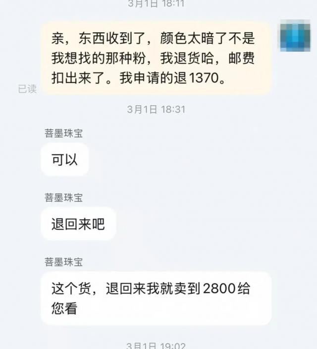 戴女士说,第一次退货的时候,商家的话有点不愉快。当时她说自己付邮费,申请退货。 1370,没想到商家回复“可以。这货退了,我就卖了。 2800 给你”。而且在她第二次退货的时候,商家直接说“收不起就别收”。