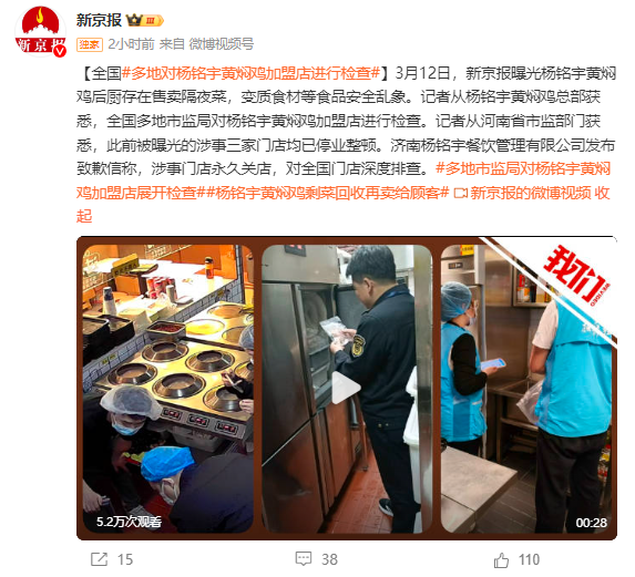 3月12日,媒体曝光杨铭宇多家红烧鸡饭加盟店存在多项食品安全问题:使用存放多日的酸性食材,回收销售顾客食用后的剩菜。随后,杨铭宇红烧鸡官方微博发布回应,向消费者道歉,表示全部责任。