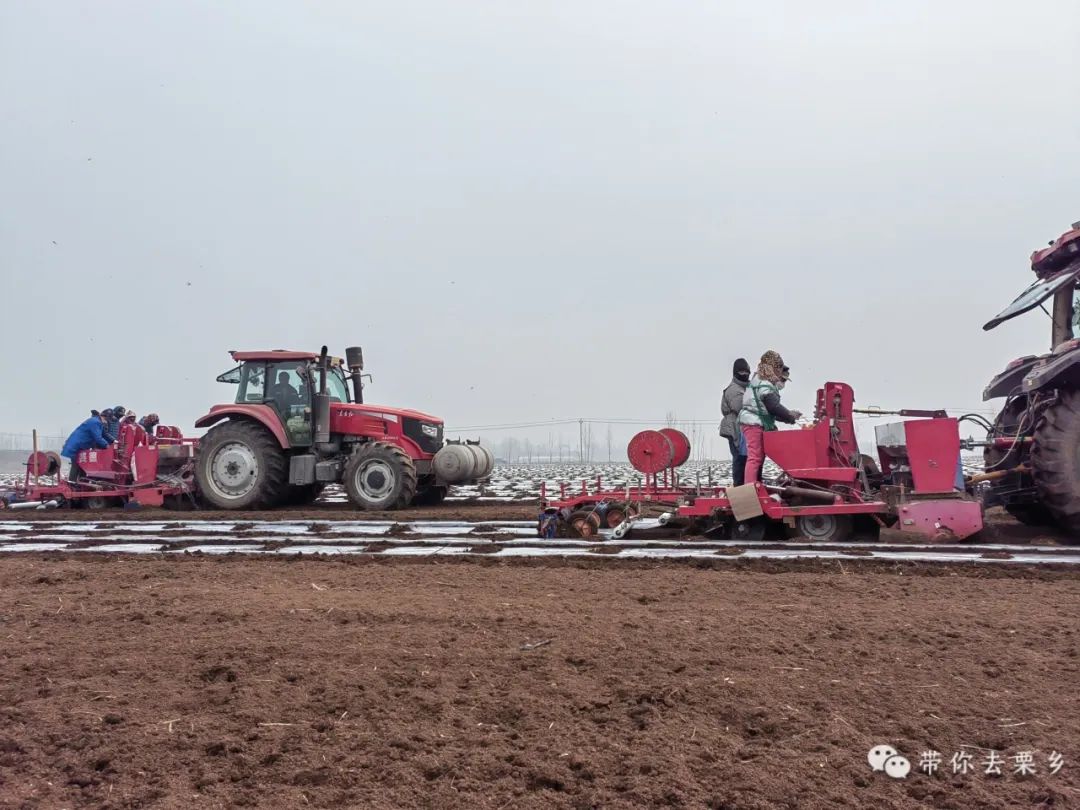 当你走进种植基地时,你可以从远处听到土豆起垄覆膜机的隆隆工作声。环顾四周,你会看到一望无际的土地。刚翻土就像一条巨大的巧克力绒毯,精心整理,散发出淳朴醇厚的土壤气息。基地种植者正在熟练地利用机械在田间工作,一次性完成开沟、垄断、施肥、播种等多道工序。承载着丰收期待的土豆扎根沃土,田间地头繁忙。