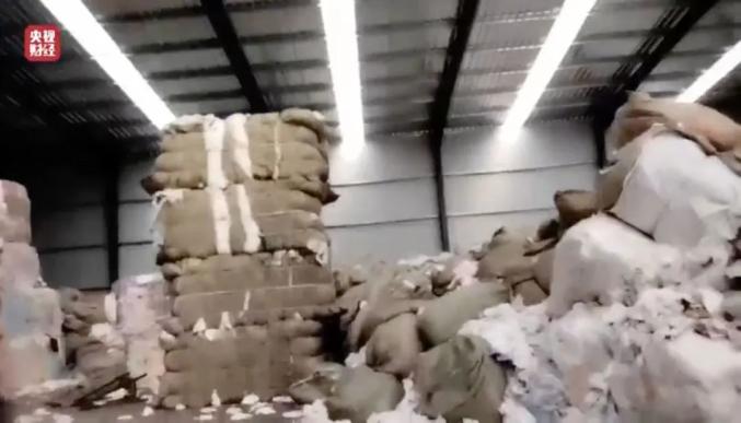 接着,刘总又把记者带到了另一个仓库,这里还堆积了大量的纸尿裤和卫生巾生产垃圾制成的货物。