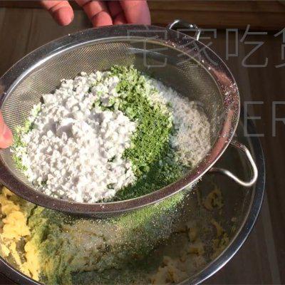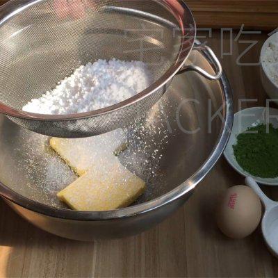 5、筛入玉米粉 30 克、抹茶粉 8 克、低筋粉 150 克、盐 1 克。