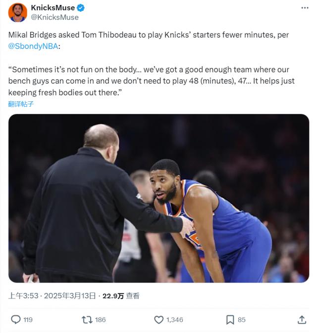 根据目前的情况,锡伯杜不可能减少球员的出场时间,球员对长期出场的挑战越来越不耐烦。此外,尼克斯目前对阵联盟强队的状态并不好,所以尼克斯实际上面临着非常大的挑战。怎么处理?这取决于后续消息。