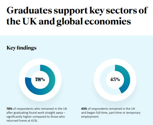 应届毕业生的福利仍然很受欢迎。而且在 QS 与 Universities UK(UUK)联合发布的《International Graduate Outcomes 2024》中说明,有一些受访者毕业后留在英国, 78% 人们立刻找到了工作。