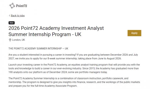 顶级对冲基金 Point 72 英国地区也开放了 2026 Academy Investment Analyst Summer Internship Program,面向于在 2026 年 12 月至 2027 年 7 每月毕业的学生开放。