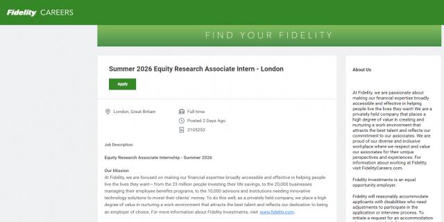 英国投资巨头 Fidelity 伦敦办公室开放 2026 Equity Research Associate Intern 职位,项目就是它 10 周,面向于 2027 学生开放。