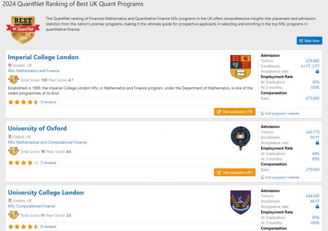但在2024 在英国量化硕士项目排名中,帝国理工学院荣登榜单,再次压牛津大学一头。这所学校的 Mathematics and Finance 项目学生毕业 3 几个月后就业率就达到了 100%,毕业生薪水更高达 7.5w 元。