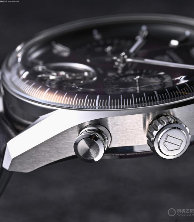 “玻璃盒”,泰格豪雅卡莱拉陀飞轮, 42 mm,为了容纳陀飞轮,尺寸比常规自动记时大。凸起的“玻璃盒”镜面稍微增强了手表的厚度(14.3) mm),这是可以理解的。表壳装饰由正向大规模抛光和侧面水平拉丝组成。圆口的计时按钮和多个切面的耳朵都是复古的味道。