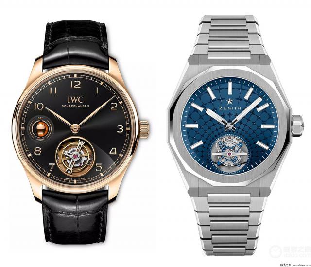 万国葡萄牙陀飞轮昼夜显示(左)和真力DEFY 长空陀飞轮(右)