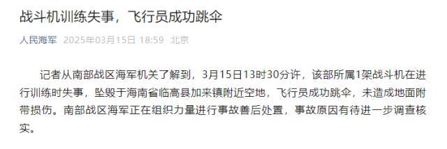 记者从南部战区海军机关了解到, 月 15 日 13 时 30 分许,本部所属 1 战斗机在练习中失事,坠毁在海南省临高县加来镇周边空地。飞行员成功跳伞,没有造成额外的路面损坏。南方战区海军正在组织力量进行事故善后处理,事故原因需要进一步核实。