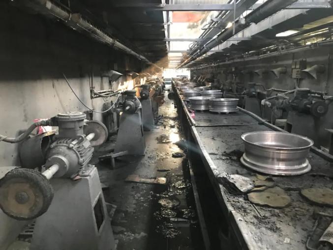 成立于2020年9月的华川机械加工有限公司,注册资本200万元,占地约2300平方米,年产值约800万元。事发当天共有58人在现场工作,主要从事铝合金轮毂抛光抛光工作。抛光抛光产生的粉尘通过湿式风道从下吸风口进入湿式除尘器,每10-15分钟在湿式风道内洒水一次,每次持续2-3分钟。抛光区上方的吸风口通过干式风管进入干式袋式除尘器,干式除尘系统进行排风,然后进入湿式除尘器后排到室外。