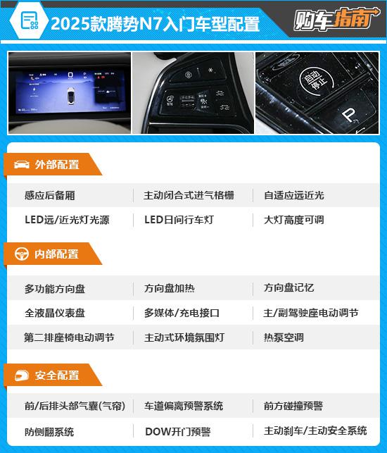 2025 款腾势 N7 入门级车型为 702 智驾双激光高贵版,厂家指导价 25.98 万元。从设备水平来看,这款入门级车型整体表现不错,可以算是入门级的高配,比如自适应远近光、前方 / 后排头部气囊 ( 气帘 ) 、车道偏离预警系统,主动刹车 / 使用频率较高的配置,如主动安全系统、第二排座椅电动调节等。与此同时,还有感应后备箱、城市路段、高速路段自动驾驶辅助等先进设备的支持,整体性价比较高。考虑到价格、设备、性能等诸多因素,702 智驾双激光高贵版是这次最推荐的车型。
