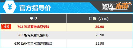 顶配车型 630 与推荐车型相比,四驱智能驾驶双激光旗舰版增强了双电机四驱系统,配置更多。 AR-HUD 增强现实抬头显示,车内香气设备,iADC 智能化漂移控制系统和 iCVC 智能化底盘矢量控制系统,其升级主要集中在驾驶体验上,如果只是日常使用,那么升级的重要性并不十分重要,而且两款车型的差价达到了 3 一万元,性价比一般。