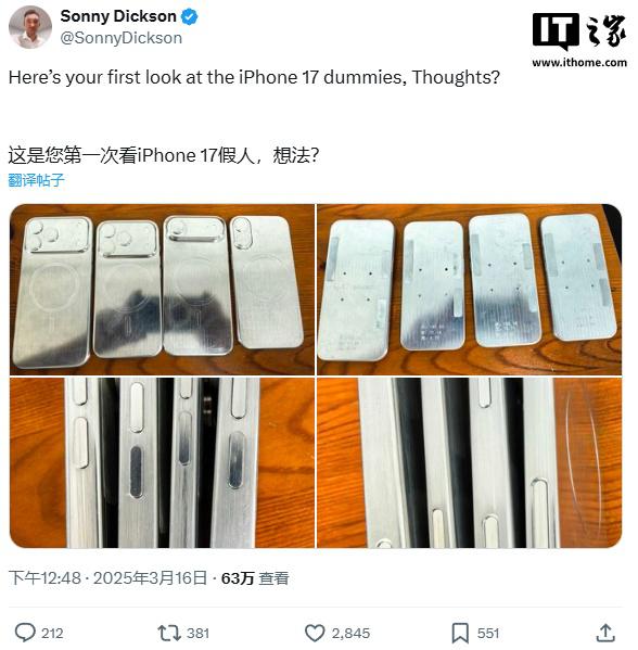 IT 世家 3 月 17 日消息,爆料人桑尼・迪克森 ( Sonny Dickson ) 昨天晚上发布了一组 iPhone 17 手机模型机系列照片,包括中文注明的大小信息。