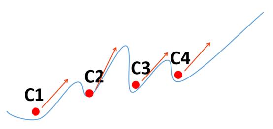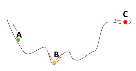 最具欺骗性的是右边的C球,看起来和B球处于同样的平衡状态,很容易回到起点。其实更像是A球,只要动力稍微大一点,就可以继续向下移动。